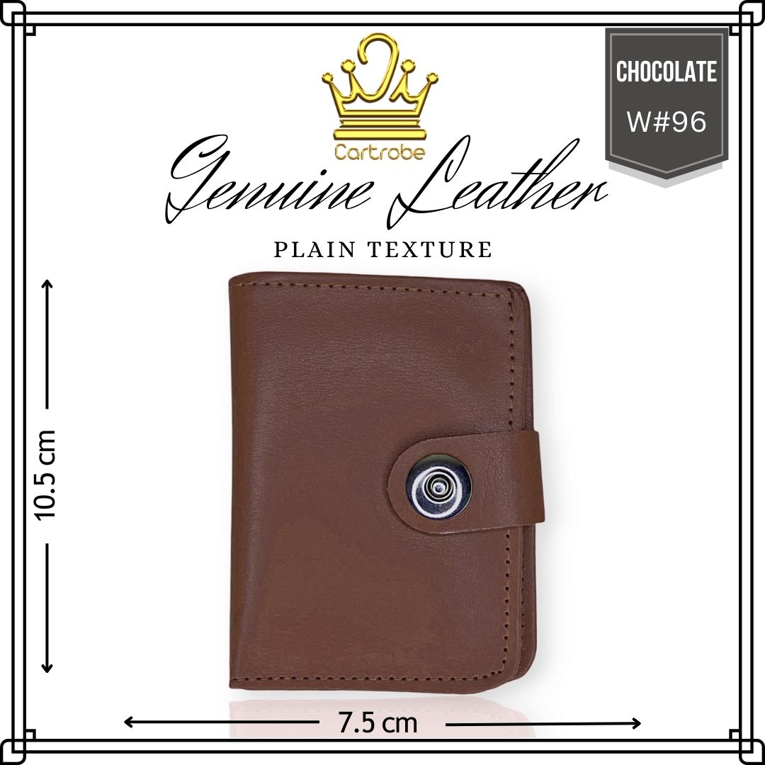 This stylish wallet features a magnetic button closer, multiple card holders, and a spacious cash pocket, making it perfect for daily use. Crafted from genuine leather with a plain texture, it’s both durable and elegant.